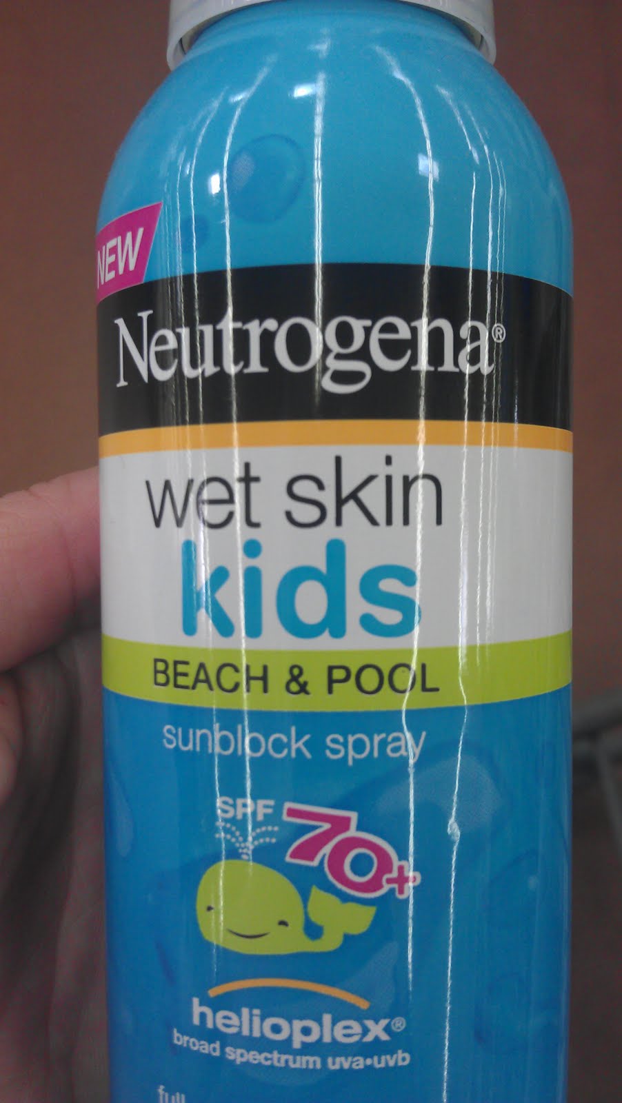 When I went shopping for the sunblock, I found that they had a “beach and pool” wetskin sublock for kids! Even better, 70SPF! What I also found out is that Neutrogena is the only sunblock I could find that “heliloplex” technology which means it protects against UVA and UVB rays. The more protection, the better!