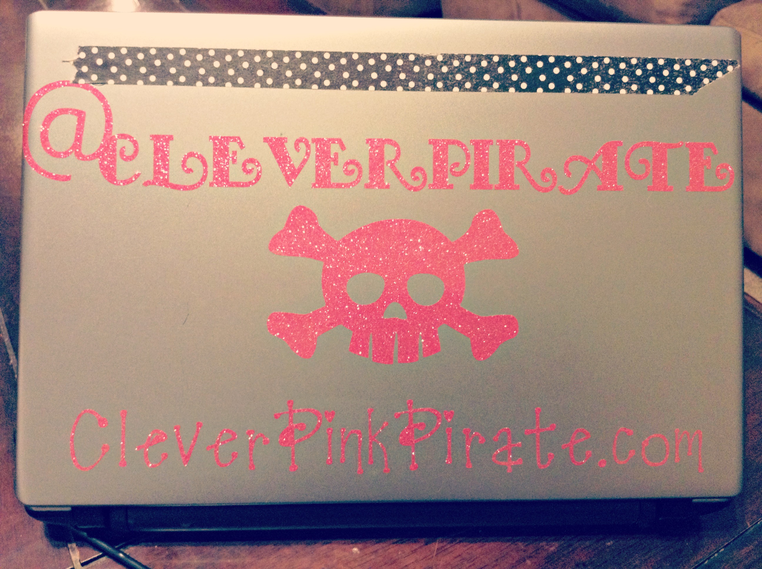 I ordered Oracle 12×24 Ultra Glitter Melon. I love the oracle vinyl from Expressions Vinyl, it is very sturdy and shouldn’t come off unless I remove it. I cut out a pirate skull and my Twitter/Instagram name along with my website in the glitter pink and placed them on my laptop. I cut these out on my cutting machine (Silhouette) and used transfer paper (a must with words and vinyl). This way people I’m sitting around will know who I am! I know what you are thinking, I just told you think week you don’t really need a laptop at blogging conferences. Really you don’t, I do as I always have quick bits of work to do. You can bring your laptop, there really isn’t anything wrong with it, just something else to carry.