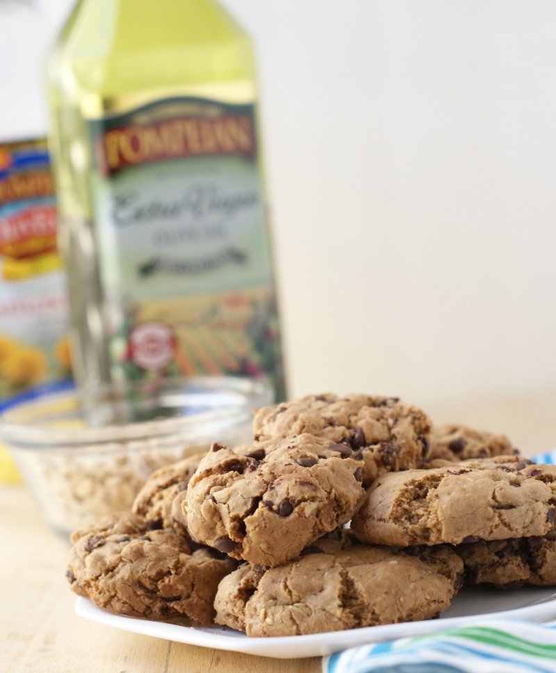 For my most recent treat, I combined my two favorite cookies: Chocolate Chip and Oatmeal. I created the fabulous Chocolate Chip Oatmeal Cookie! I also did something that I have never done to cookies, I swapped out butter for Pompeian Olive Oil.