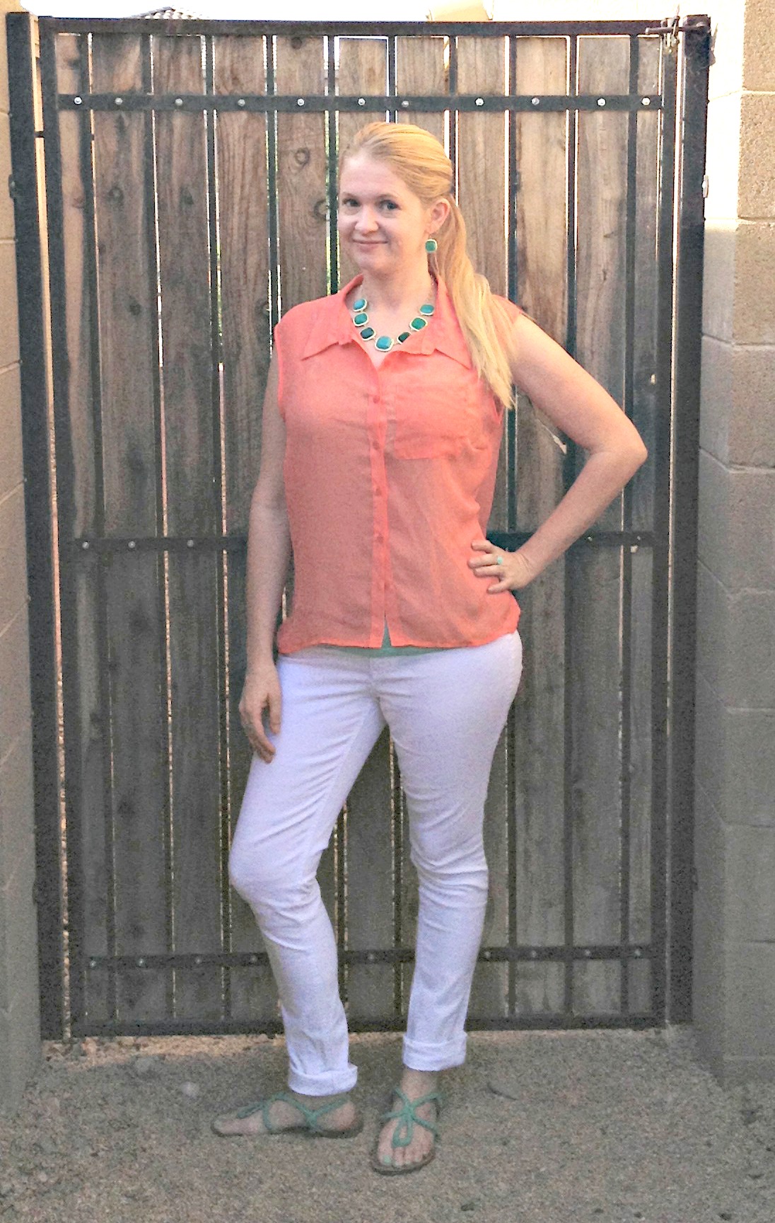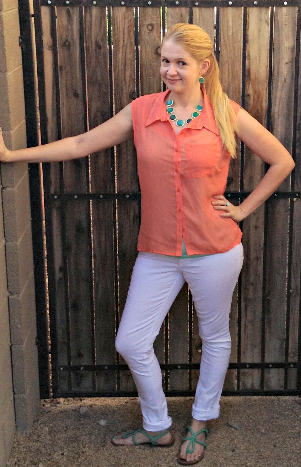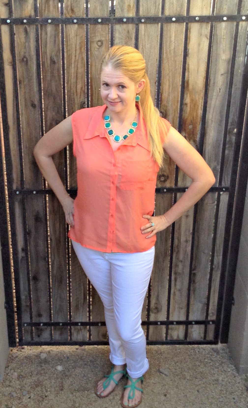 Do you have a color hue that you have been wanting to add to your wardrobe but have been a little hesitant? That is how I have been with the coral/peachy spectrum sensation. Since my skin is so fair, I have been fearful to try such delicate yet bold colors. But then I look at the latest fashion trends on Pinterest and I have found myself pinning more and more of these colors, especially paired with white. Oh white, talk about another color I am scared to wear. Not because of the color itself but because I seem to always get something on my clothes.