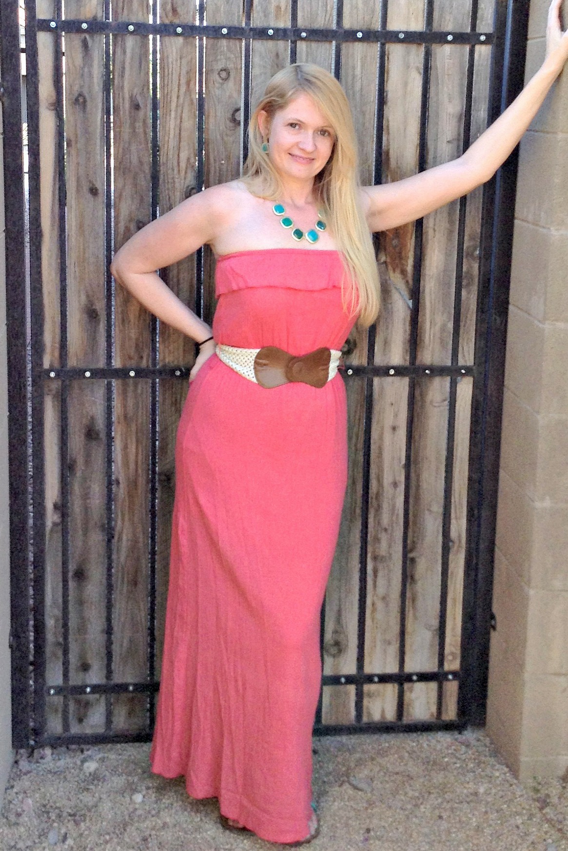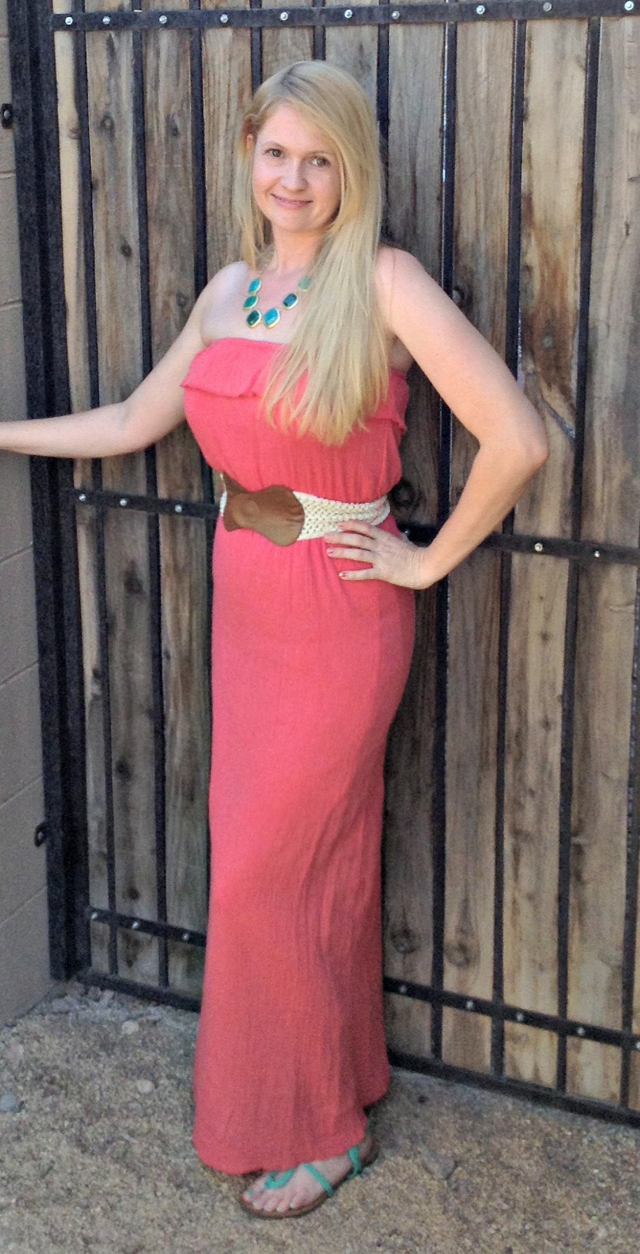 My next find was this maxi dress. A little background on my love/hate relationship with maxi dresses. I love them, I think they look gorgeous on women. My problem is that typically they are a knit material and they “gather” in the middle of my body which is not an area I want to draw attention to. I was happy to find this belted maxi that was 55% off and was not a knit! This dress was only $21.99!