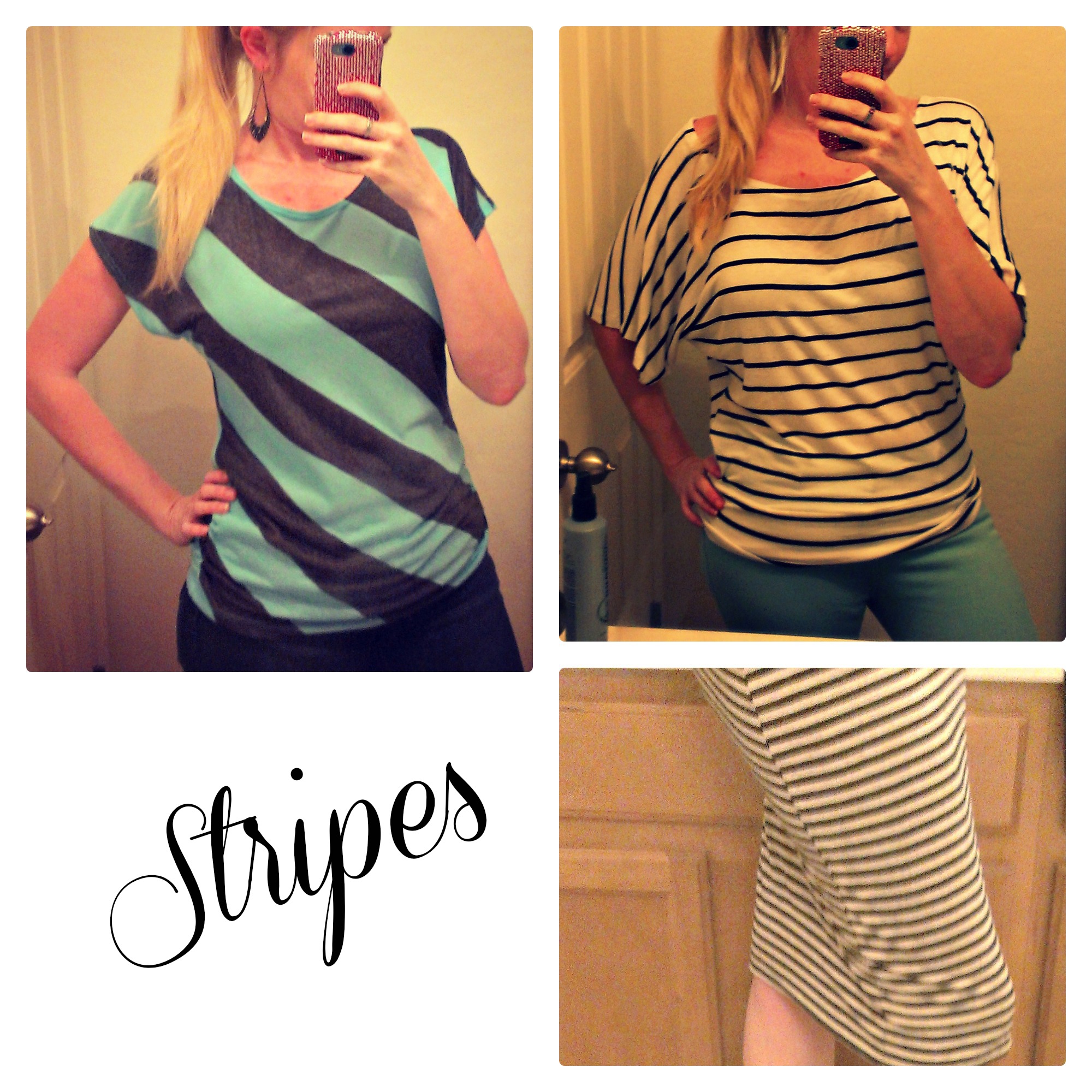 - White top with black stripes ~ I love how the wide angle and arms keeps the top from sticking to me but the waist on it comes it still making it fashioable and a perfect pair with colored skinnys. (Ross $7.99)