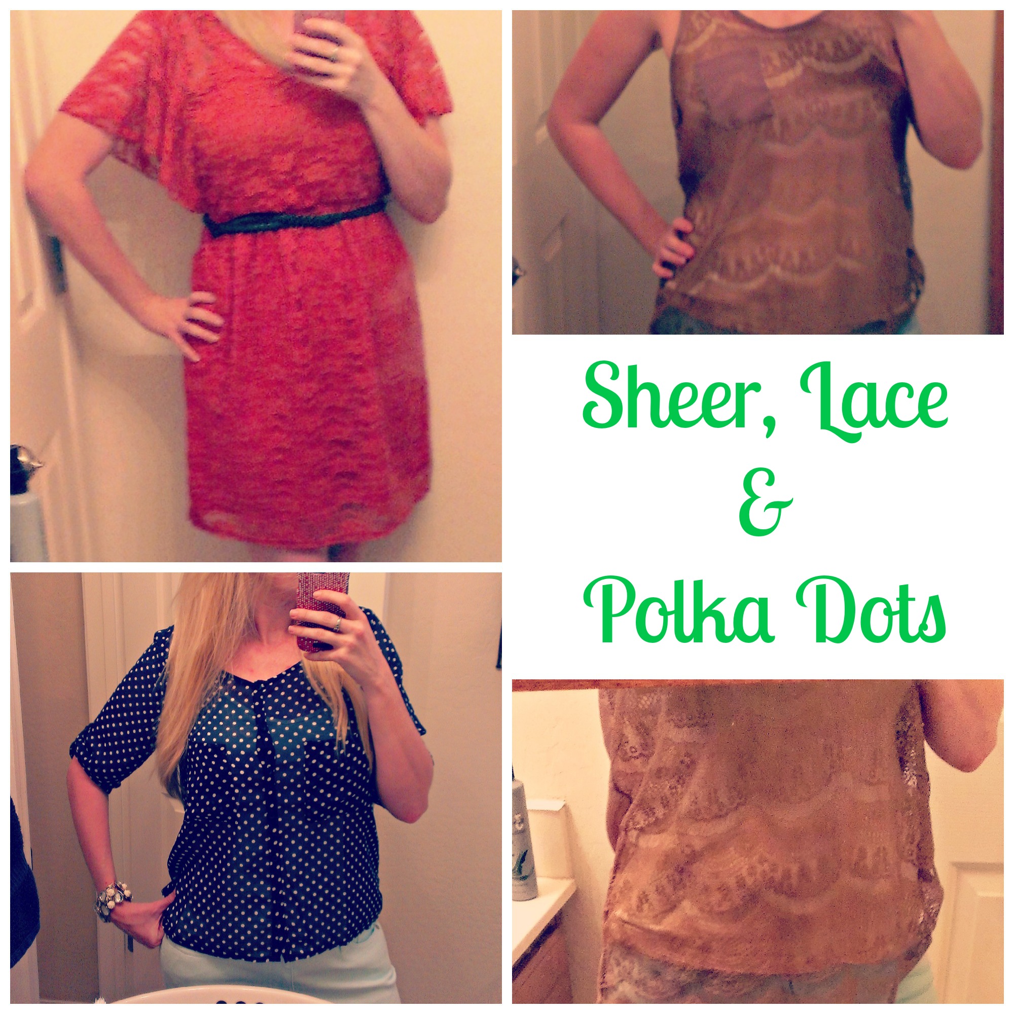 Oh Lace, how I have always loved it! If I wasn’t so embarrassed I’d show you my prom pic from high school, head to do lace! I’m glad lace is always trendy! A new fav for me is sheer tops and they are definitely popular right now. I love the textured and patterned ones as shown with this Navy Polka Dot top.