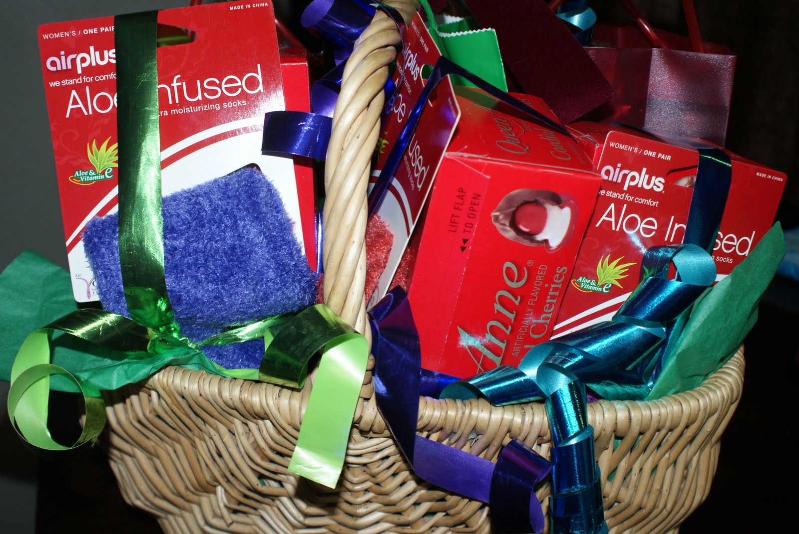 I took curling ribbon and wrapped everything up along with some cute giftbags and holiday colored tissue paper.