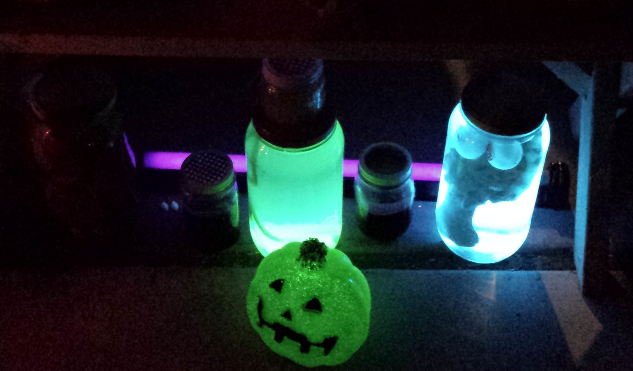 I love the pickle jars to make mad science jars. You can put in items from the dollar store an just color the water! We did 3 different jars, one filled with tonic water so it glowed blue under UV light, one jar with red food coloring and water and the last jar had water with glow in the dark paint mixed in. I purchased a long black light at Walmart for under $11, it was a steal and it’s available in the light bulb section all year round.