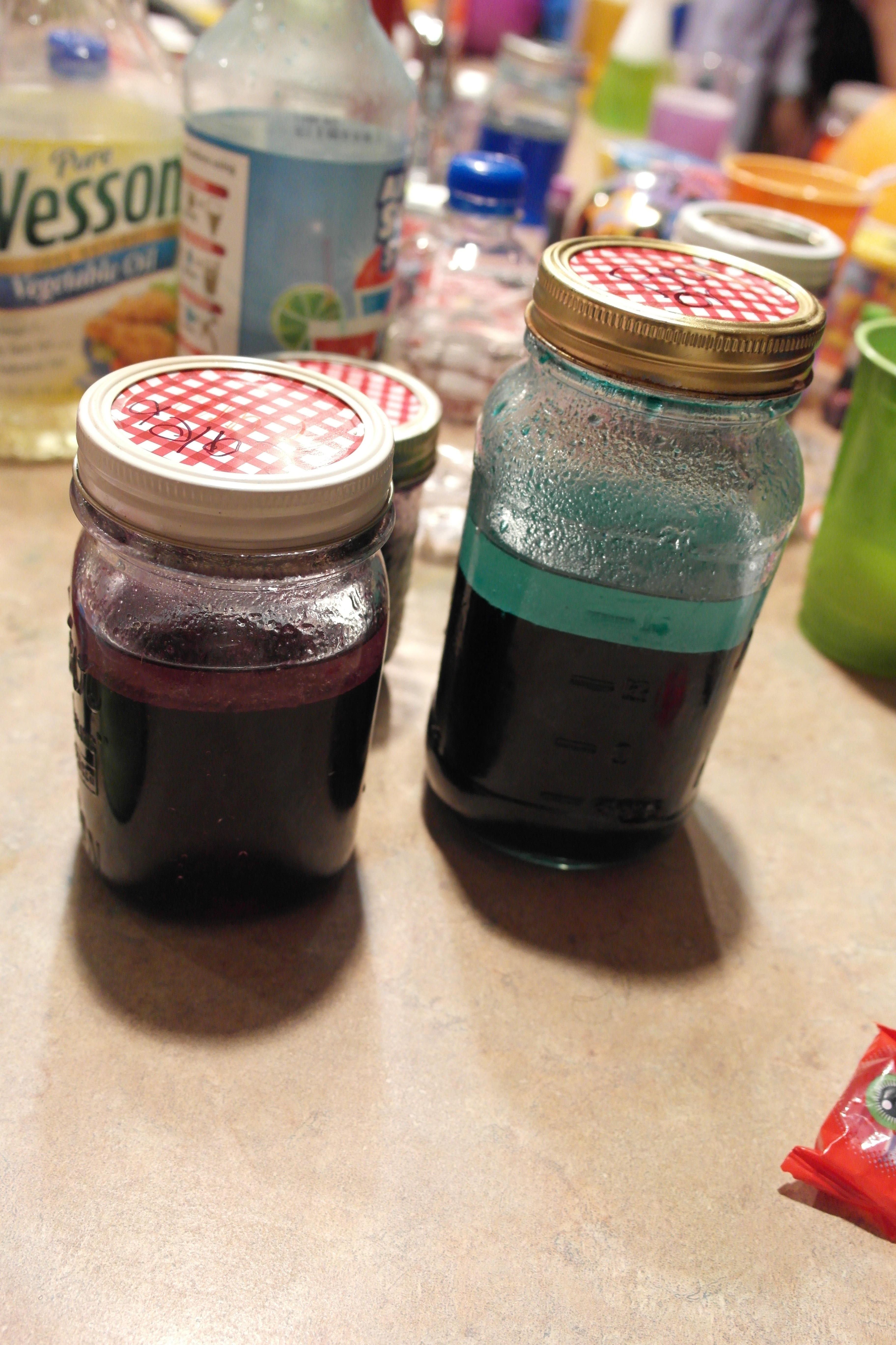 Take the cooking oil and fill a jar about 1/4 way full. Fill the rest of the jar with water until you are about 1-2 inches. Add a couple drops of food coloring. Have your lid ready, add 1 alka seltzer and drop it in. Quickly secure that lid because if you don’t you’ll see the reaction all of your floor! Otherwise in the jar, it will make a really cool volcanic action.