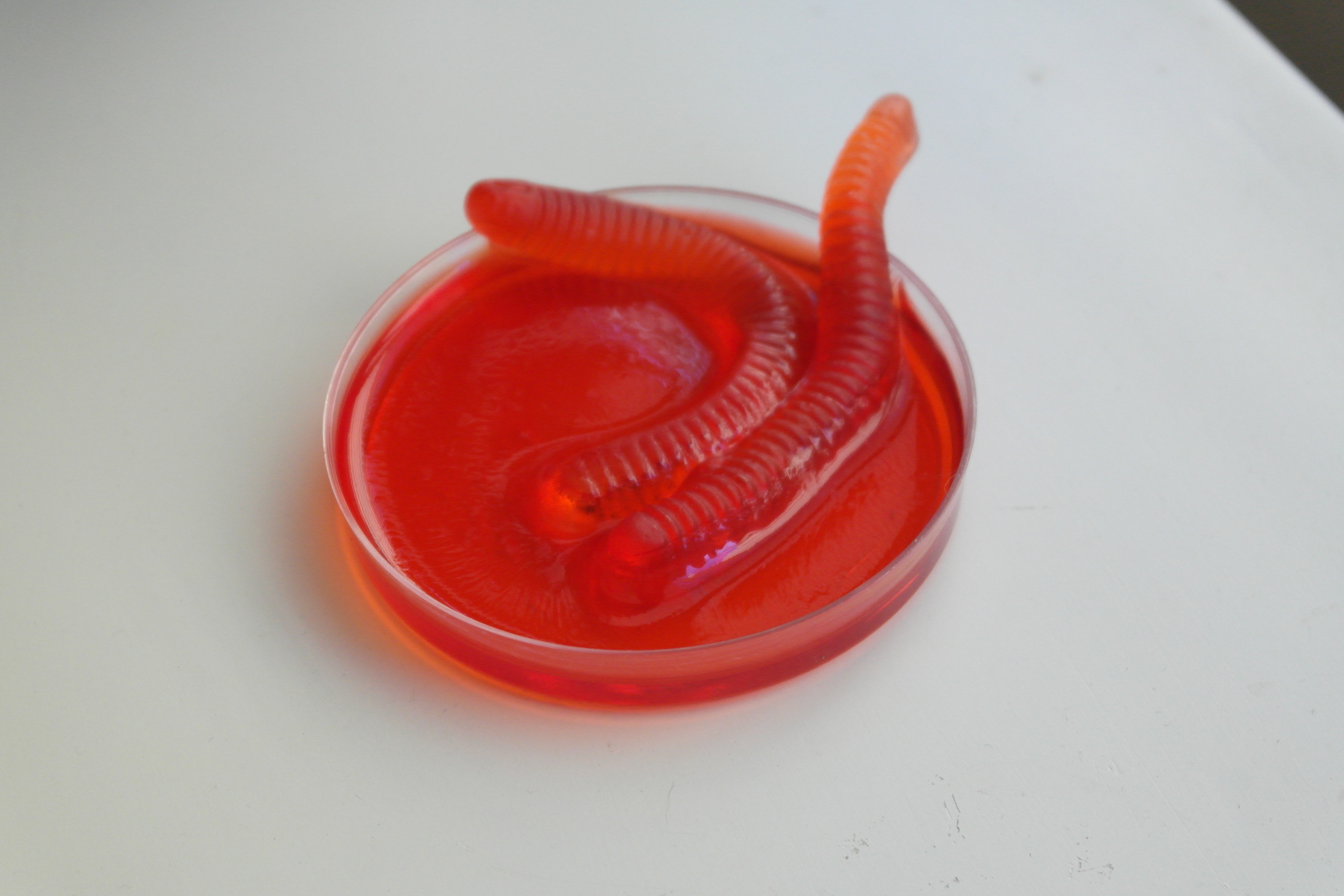 These are super easy! Just pitre dishes filled with Jello and worms. I put the Jello and worms in at the same time and let them set for a few hours.