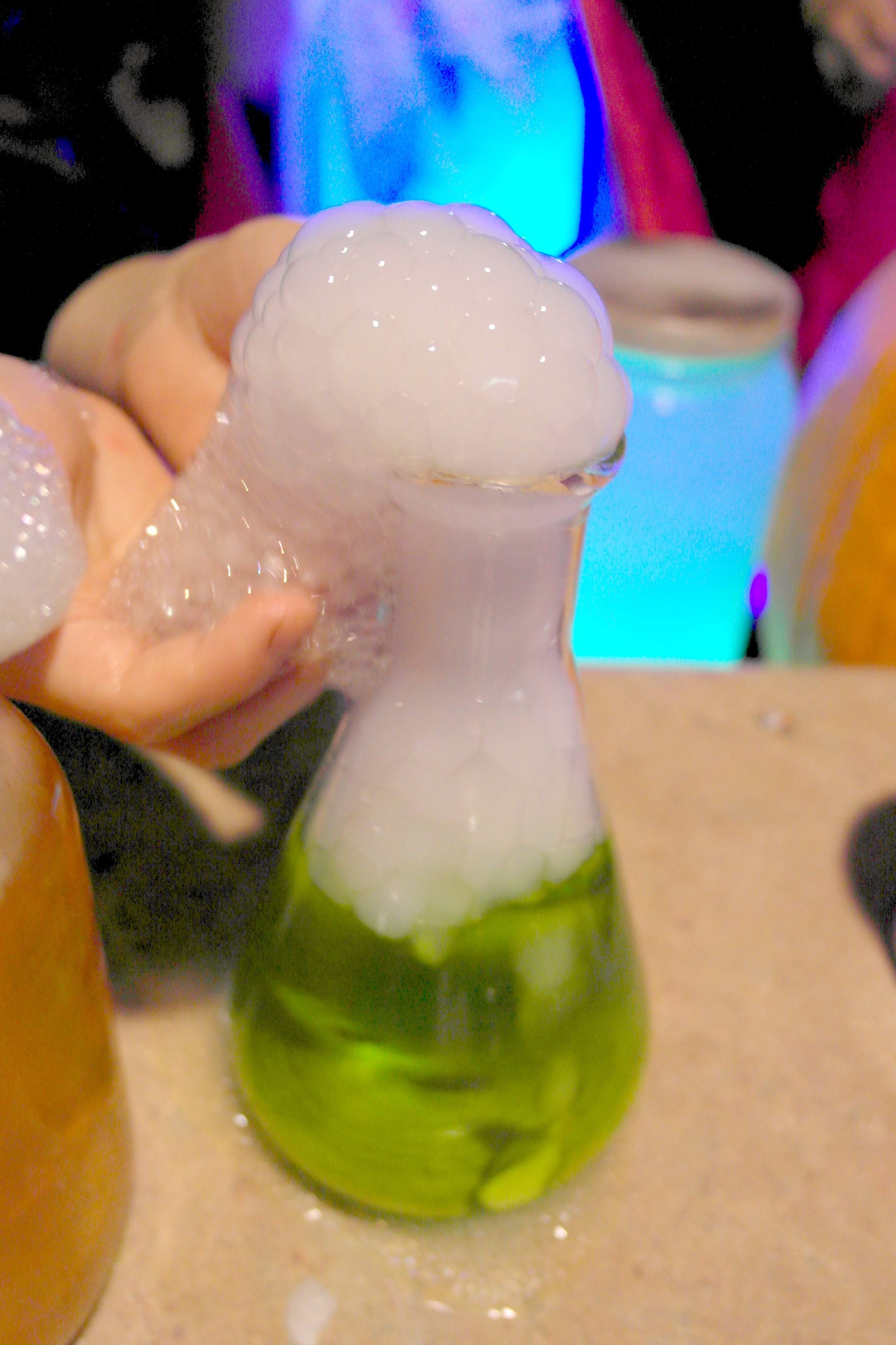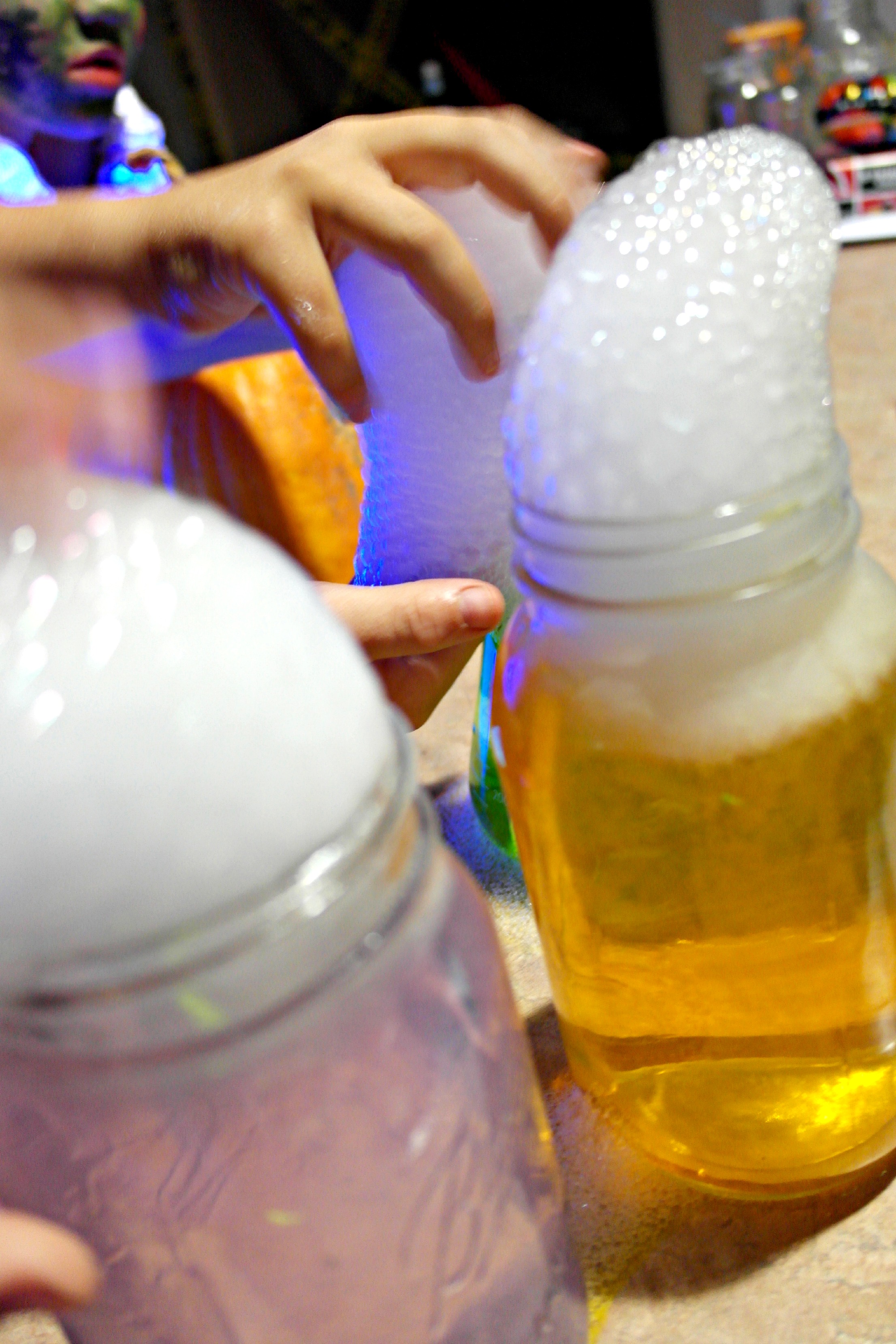 These are a lot of fun and super easy. All you need is dish soap, food coloring, water and dry ice. Take water and food coloring and fill the jars then add a couple drops of dish soap. Last, you’ll drop in a small chunk of dry ice. Watch the bubbles soar AND the kids can grab those bubbles and make them pop into smoke! It’s pretty cool!