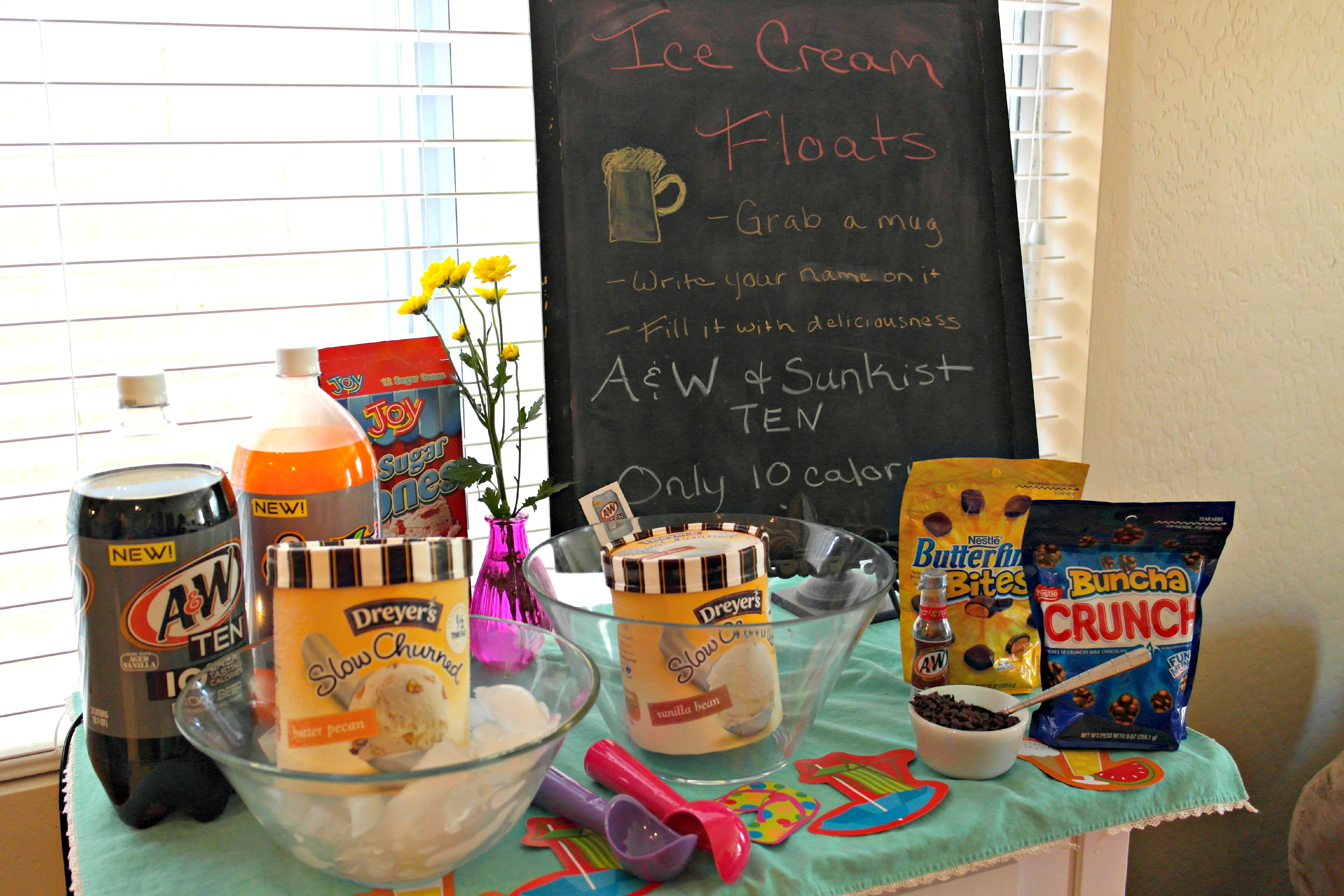 The Ice Cream Float station was a hit! Complete with the A&W TEN and Sunkist TEN along with Dryer’s Butter Pecan, Vanilla Bean and Peanut Butter Cup. The Dryer’s Slow Churned ice creams are always my first choice in ice cream because they have half the fat and they taste delicious! The floats were served in ice cold mugs I found at the dollar store.
