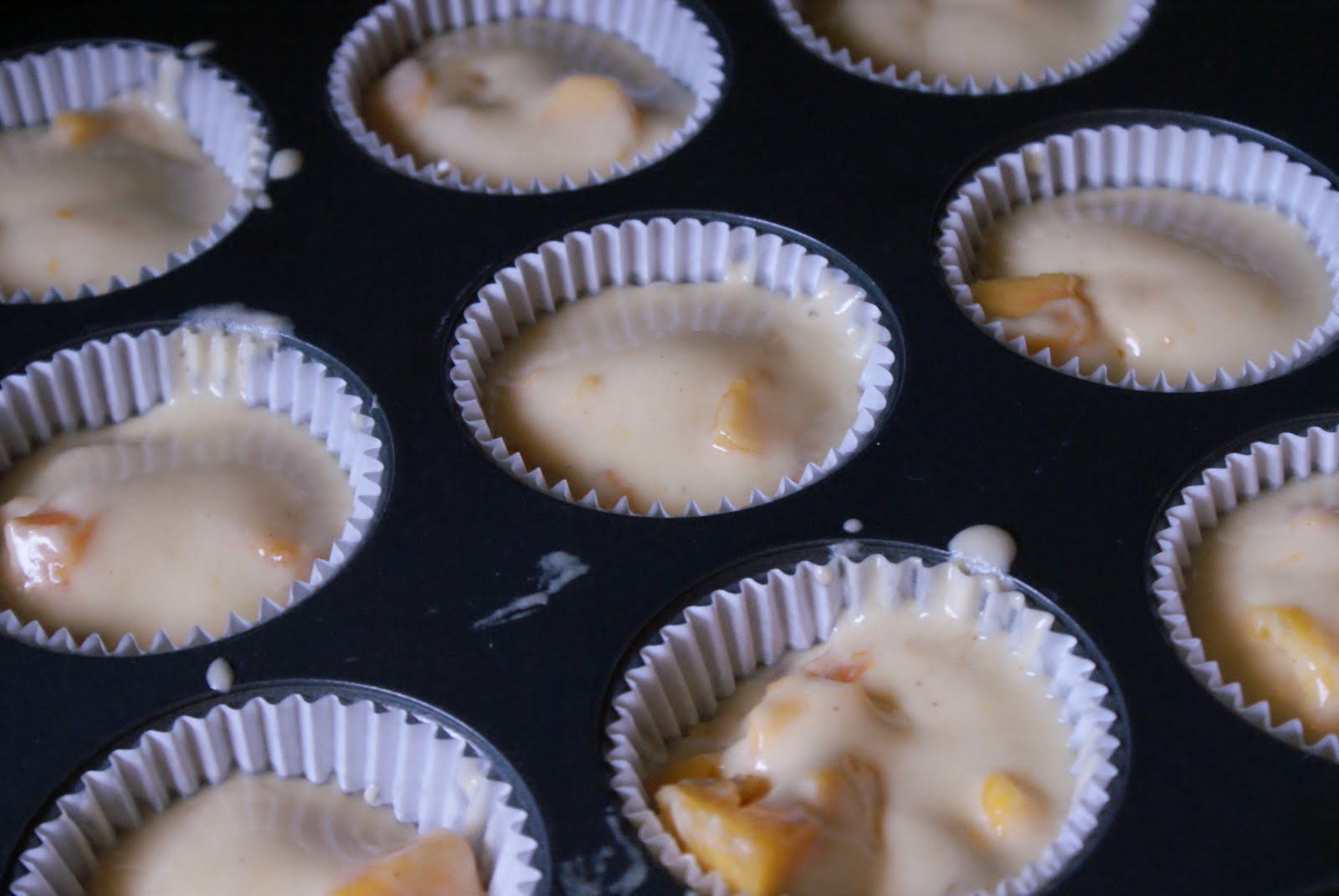 Take flour (sifted through a food processor) along with the dry ingredients and slowly mix in. Fold in the chopped peaches.