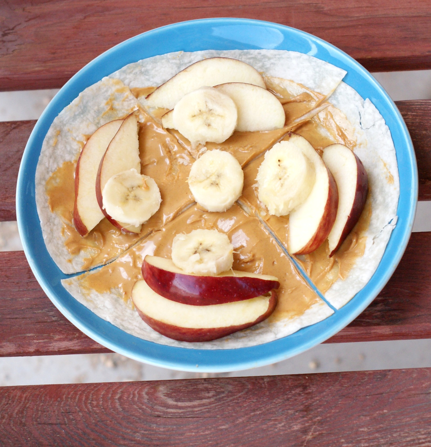 Spread the peanut butter on the tortilla, then cut into 4ths. Decorate with fruit and you are done!