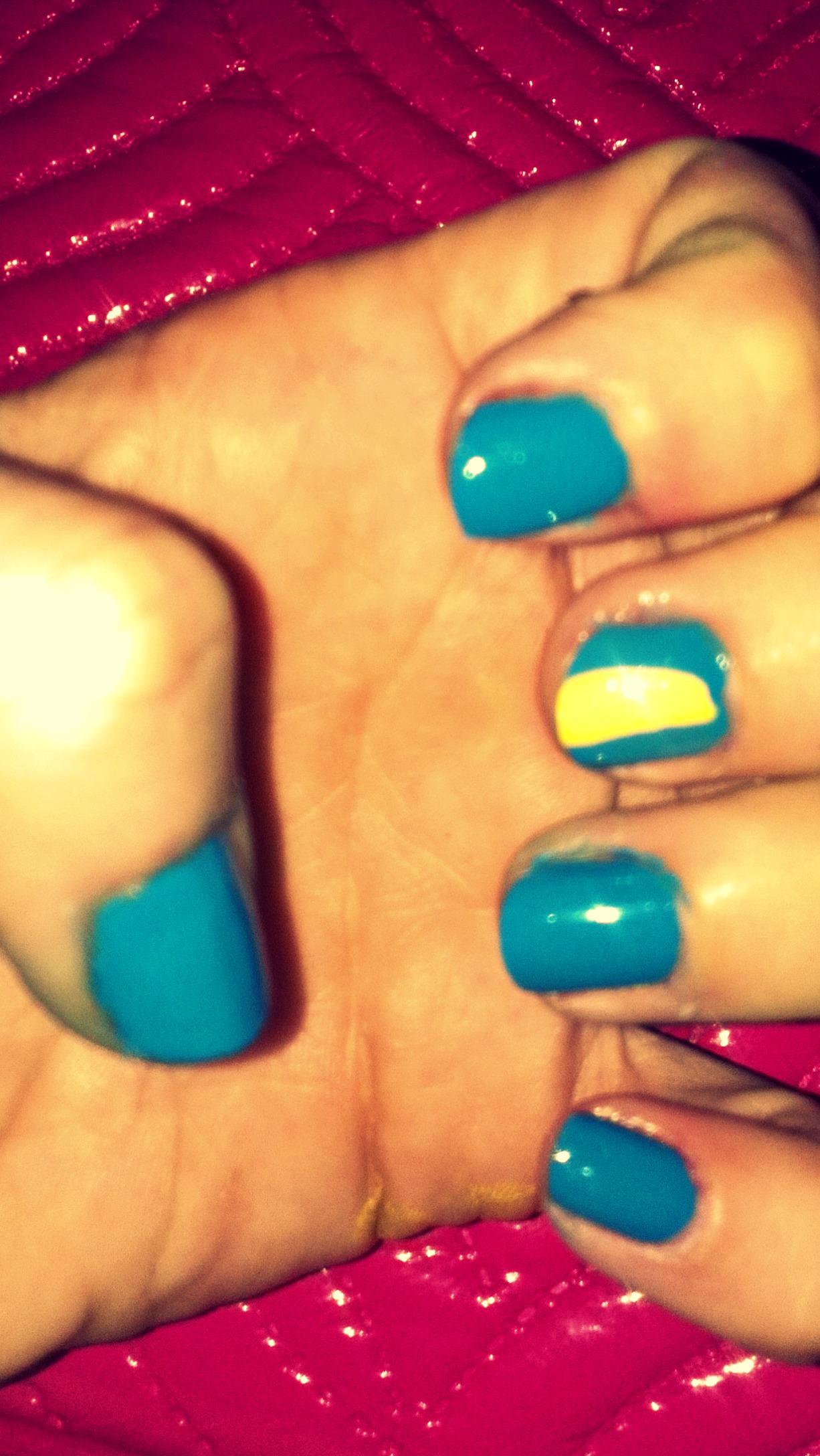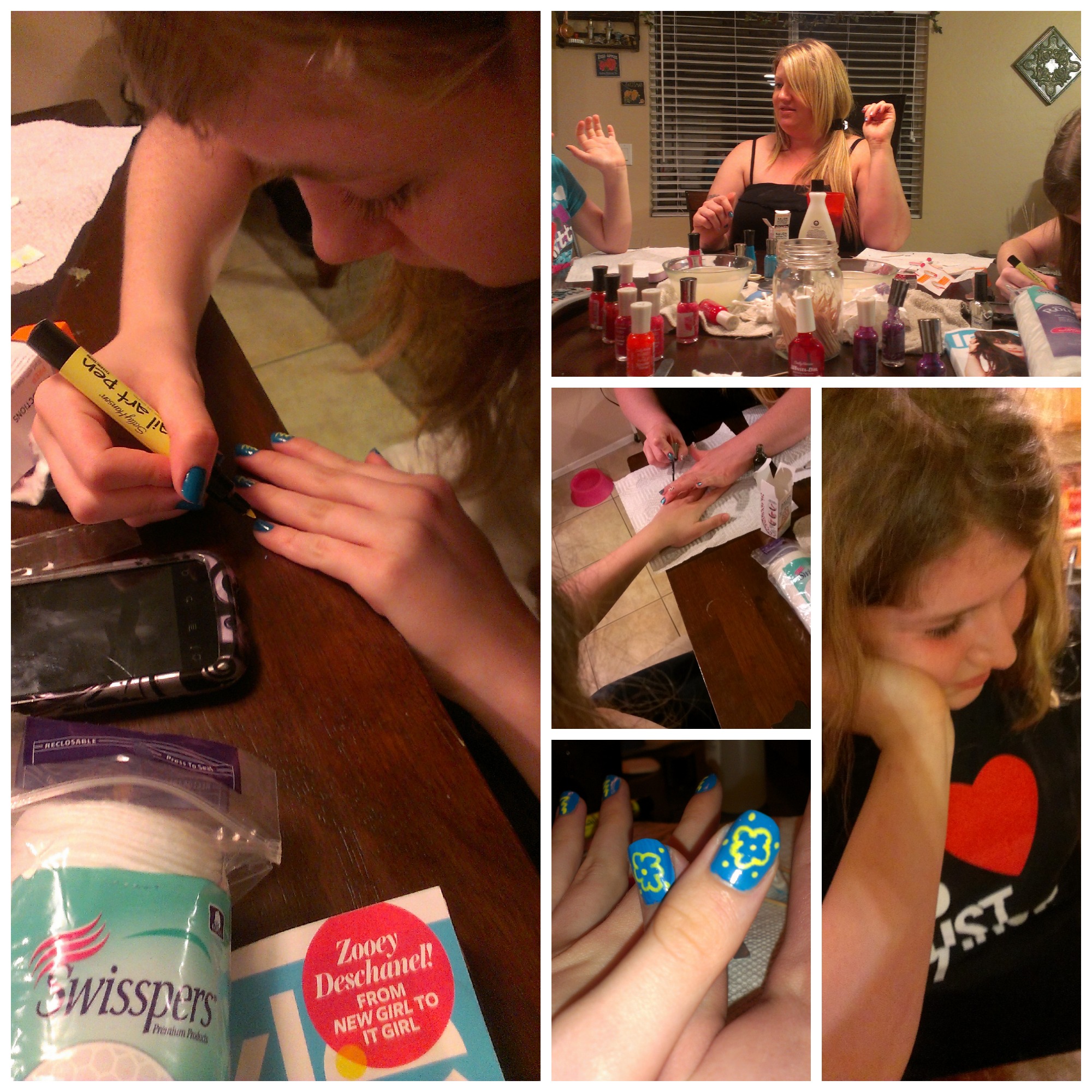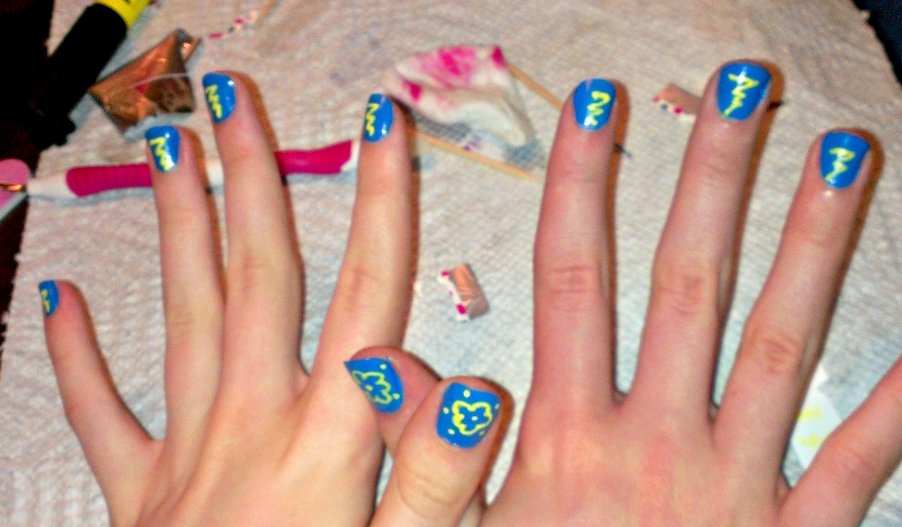 The two tweens went with different looks but both used the yellow nail art pen! Clever Tween’s friend used Brisk Blue Insta Dri polish and created a zig zag look with flowers.