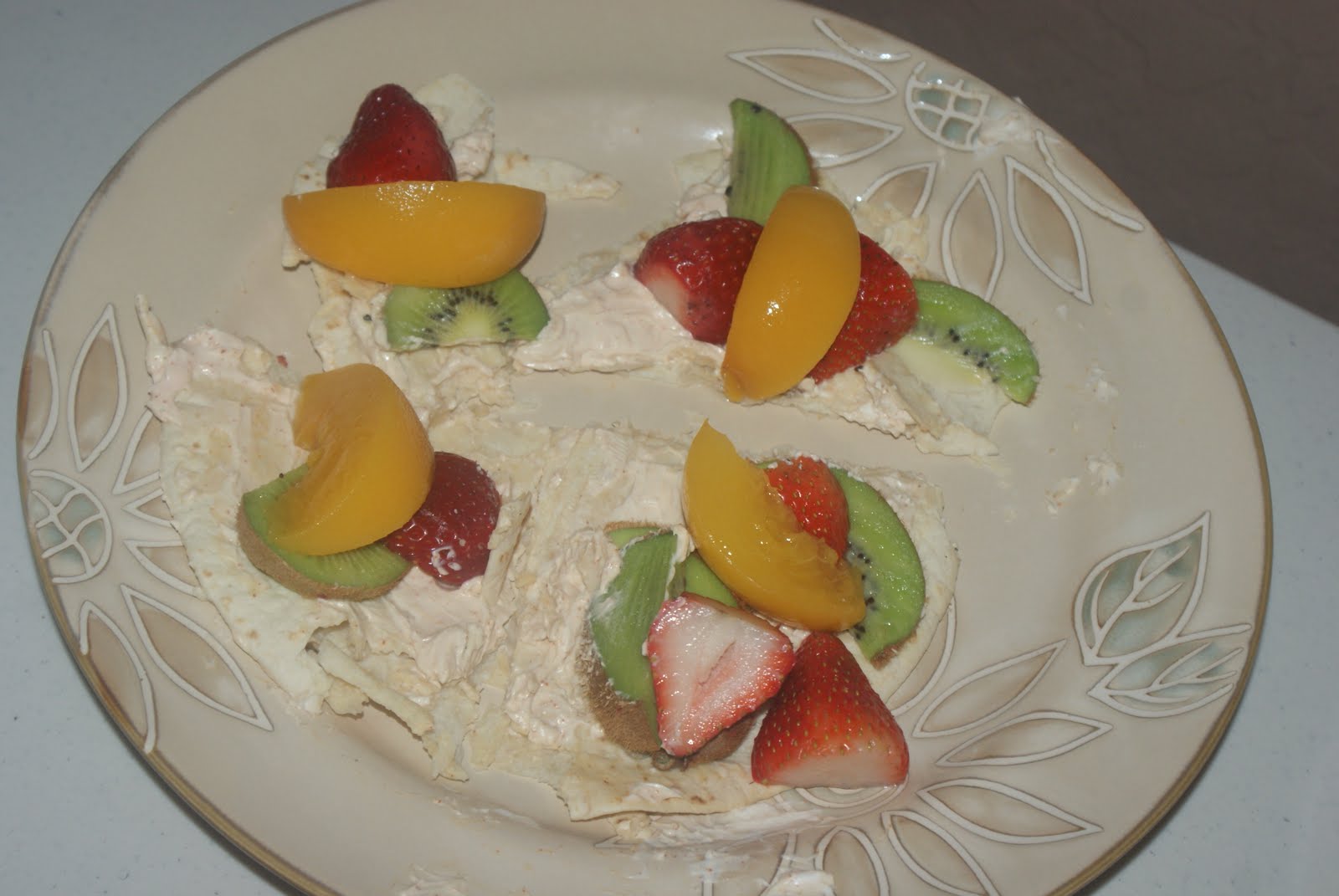 Toast tortillas in oven on 375 for about 15 minutes, flip half way through to prevent curling. Mix cream cheese and chipotle, spread on toasted tortillas. Garnish with fruit, cut and serve.