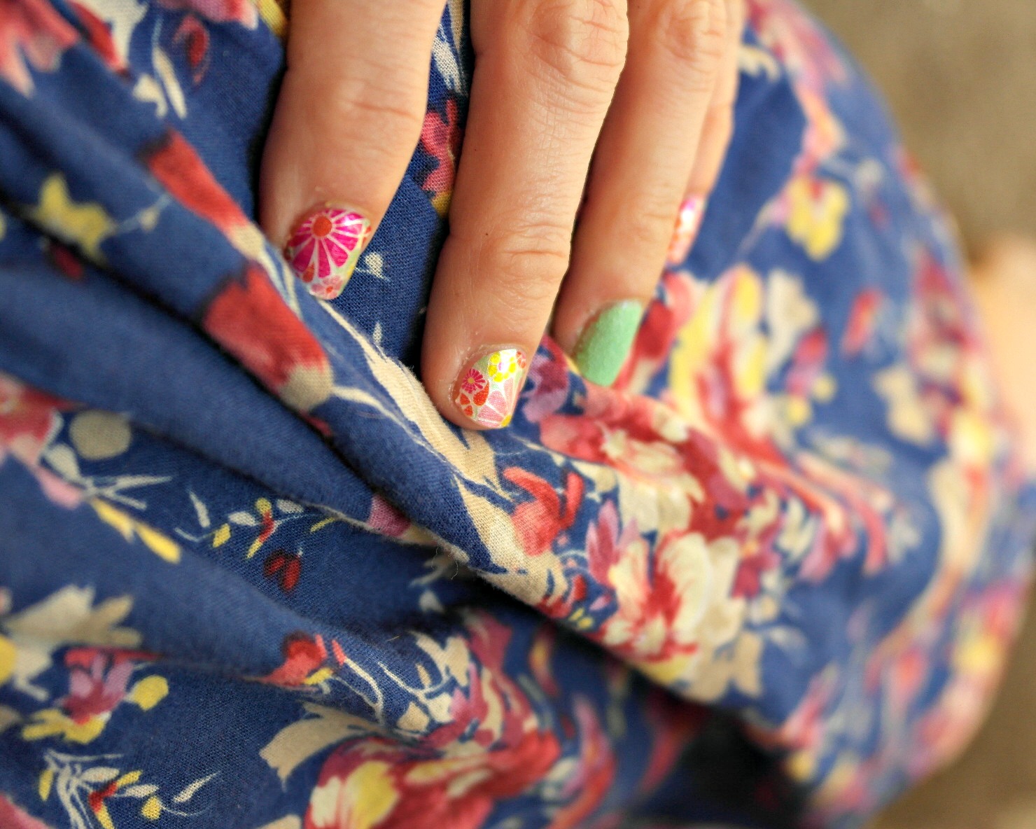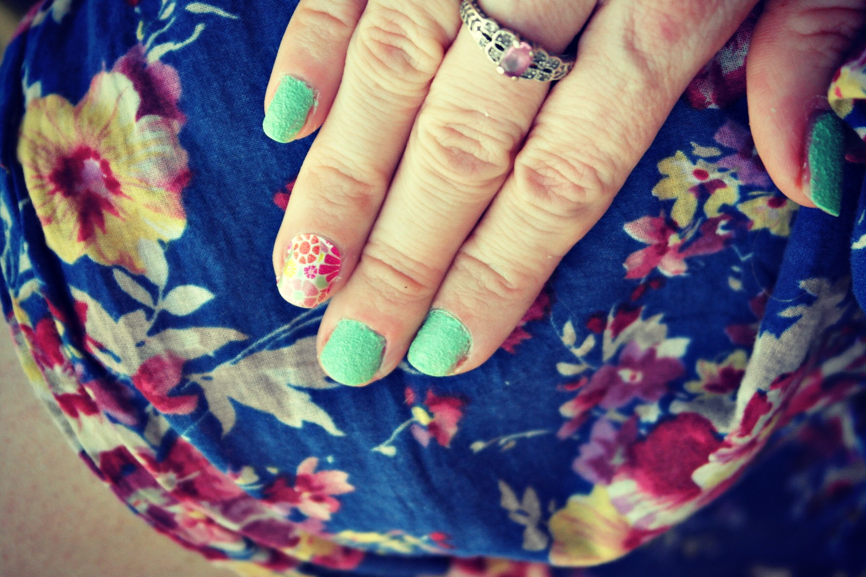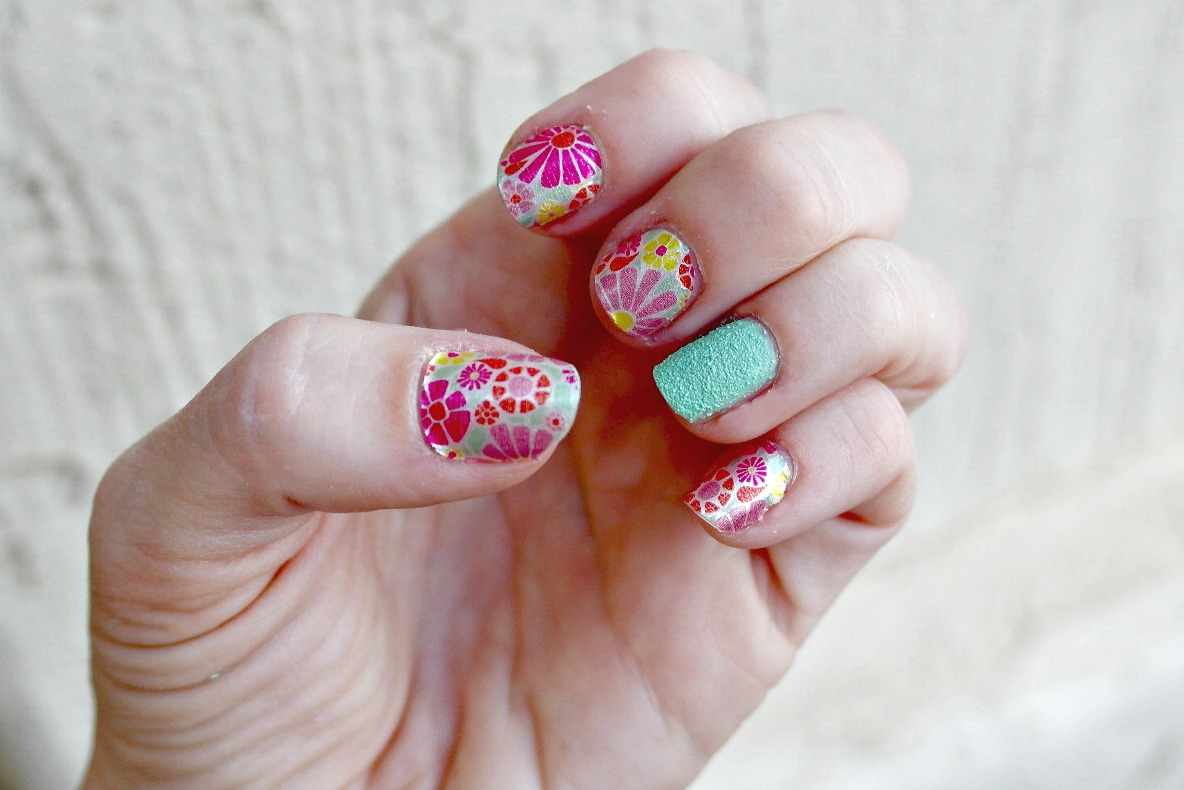 My next manicure I couldn’t wait to do. When I went shopping at Walgreens, I was there for about 30 minutes just in the beauty section. I probably looked peculiar as I was grabbing polishes and repeatedly saying “oohhhh”. When I saw the Whoopsy Daisy Salon Effects, I knew what I wanted to do. I wanted to combine it with the new Sugar Coat Sour Apple polish. I knew that this would make a perfect look for the Summer time. I wanted to use the Sugar Coat Polish as an accent nail and and I paired it with the Salon Effects. I am in love with floral prints which I think matched perfect with the sugar coat polish. What do you think?