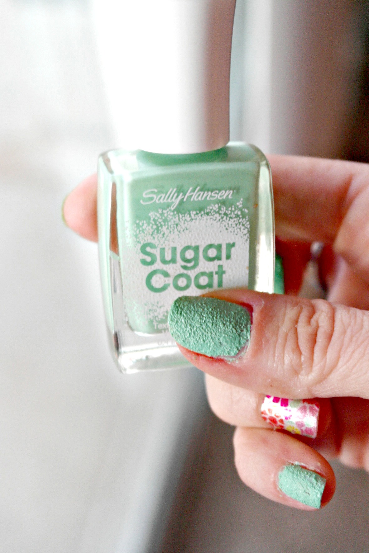 I really fell in love with the Sour Apple Sugar Coat polish. It’s a pretty mint color that is perfect for the Summer months. I don’t know if it is the cool 3D effect or my love of textures, maybe both but the polish itself is pretty cool. On my right hand, you can see that I used the Salon Effects as an accent and the Sugar Coat polish as the main part of the manicure. Here are my tips for using Sally Hansen Sugar Coat: