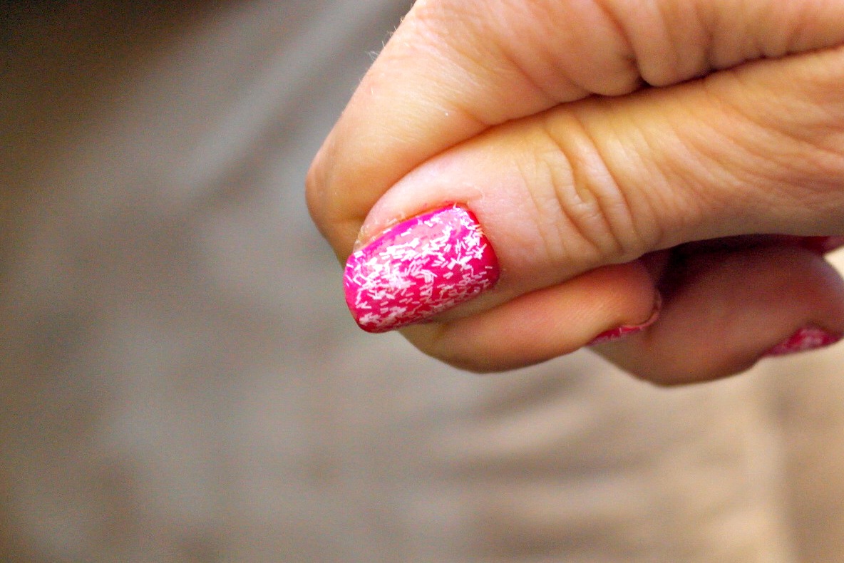 First up was the Wool Lite Fuzzy Coat Sally Hansen Polish. I paired it with the Fuchsia Power Xtreme polish. I found it was important to use a base coat with the fuzzy coat. The reason being is it comes out kind of like a clear top coat. This polish is cool because you could set your “texture”.