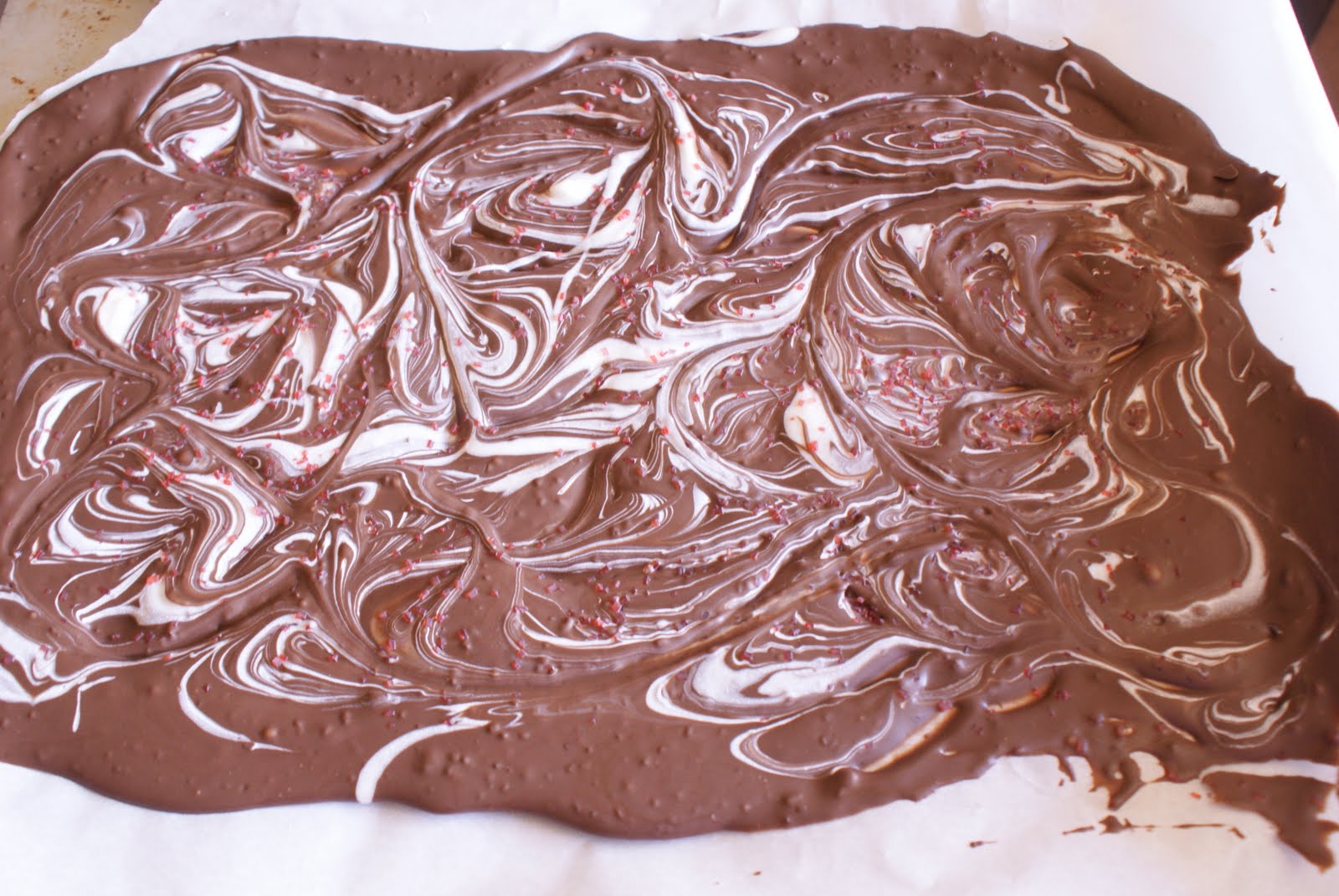 This is my cherry cinnamon chocolate bark. If you haven’t made a chocolate bark before, you are missing out! It is extremely easy and you can get really creative. It is found at your local grocery store, I think I get 2 pounds for less than $3 at Walmart (found in the baking aisle). All you do is melt the chocolate in the microwave and put in the ingredients you want. You can add almonds for an almond bark, or add nuts and marshmallows to make a rocky road bark. This one above is broken up “hot tamales” with a cherry candy flavoring (made by Wilton, can also be found at Walmart).