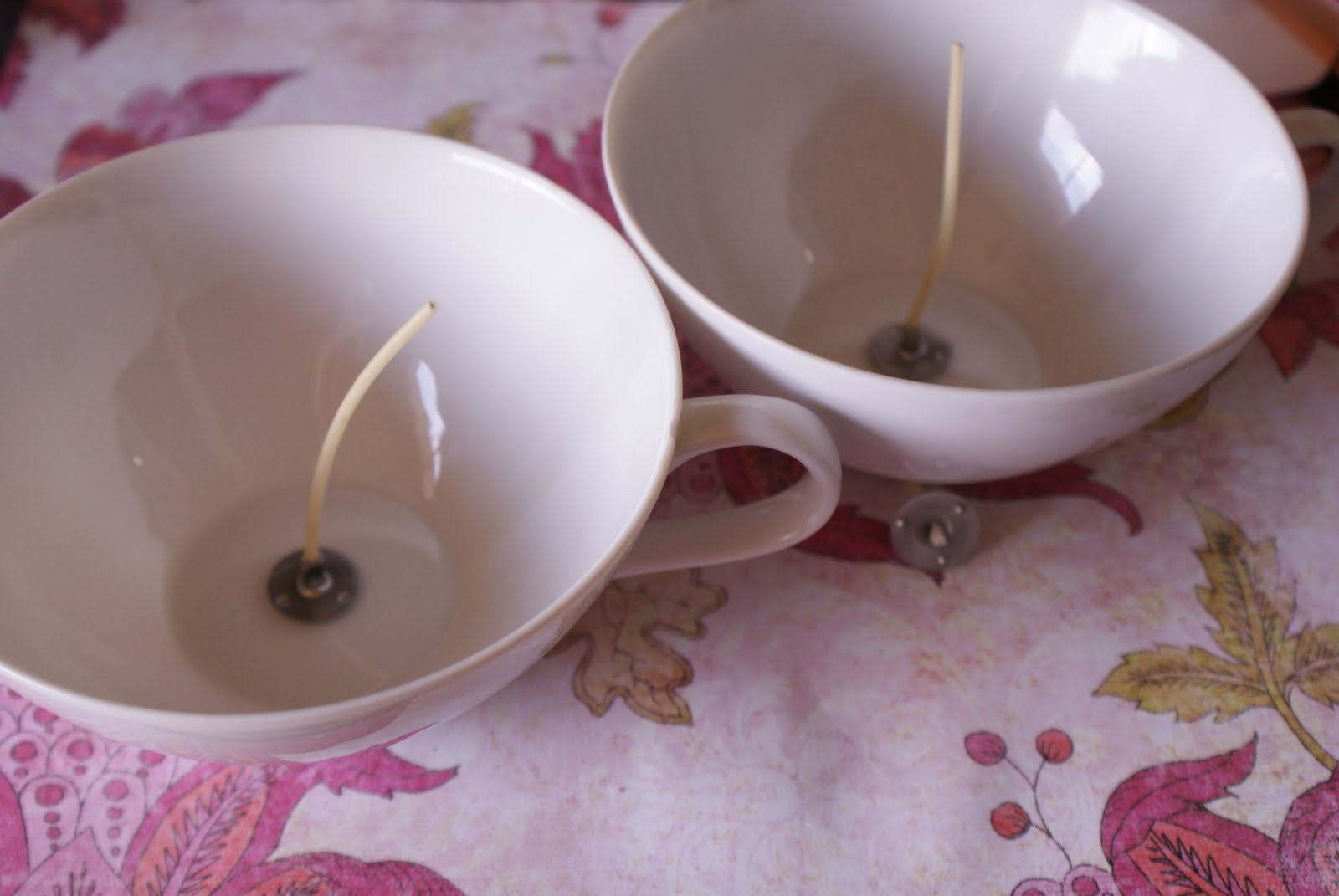 Just take a wick and glue it into the bottom of a glass, I used a teacup. Use your hot glue gun, you don’t want to have a highly flammable glue in your candle!