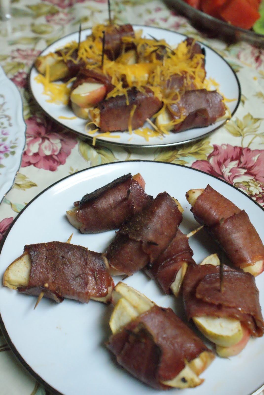 Take apple slices, wrap them in bacon and them add your favorite spice on the top. Cook for about 10 minutes on 450 and done! Easy peasy and cheesey if you top with cheese after they are done cooking.