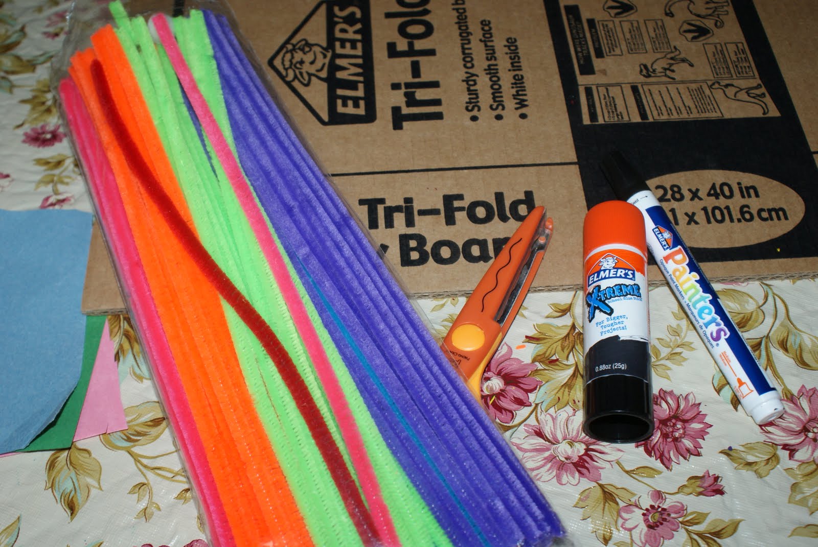 These are white “pom poms” stuck on to a construction paper leaf. After all was cut out and complete, we put everything on with the tri-fold board with an X-TREME glue stick from Elmer’s. I wasn’t sure how well this product could hold because it was a glue stick but it held everything on really well! I was surprised that even the pipe cleaners stuck on in just a few seconds! Also, it’s under $2 and great for little hands. This was a great bonding project, we will probably add this to our Summer Fun to do list for another book, especially since the Library’s summer reading program is coming up ! It’s also a pretty frugal craft! If you want to see more of our story, including our reading of the book please do so here: