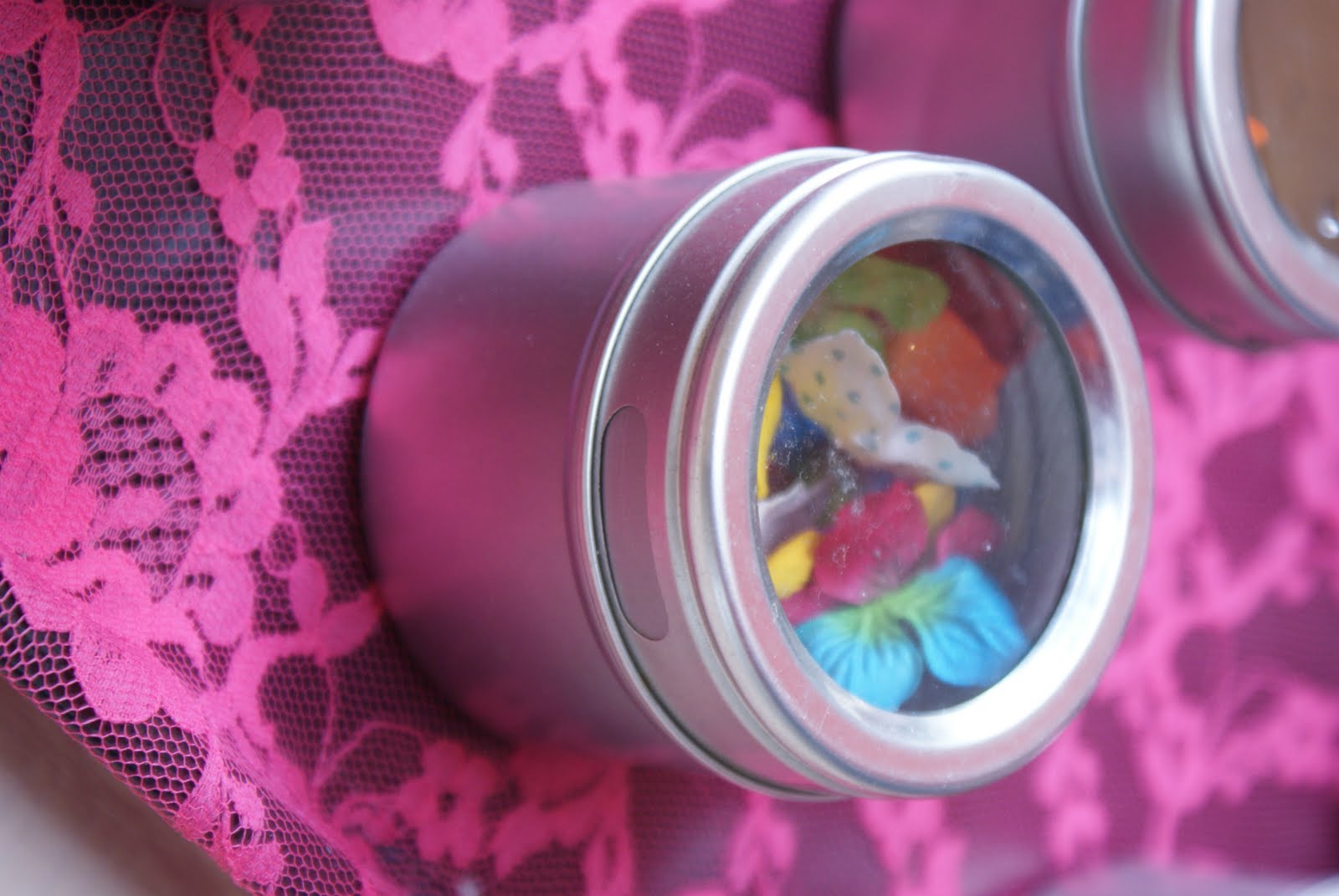 I recently had an idea to do something with an old cookie sheet. It looked horrid with all of it’s burntness, I didn’t want to use it for cooking but I could still use it! I decided to make a craft area organizer. I found this pink lace fabric at Goodwill. I also found these little spice magnet tin organizers at the Goodwill Clearance center I was really excited because I got 8 of them for less than a dollar!!
