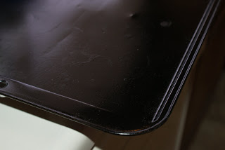 I spraypainted the cookie sheet w/ one coat with a can of $.97 black spray paint from Walmart. It didn’t need to be pretty so I didn’t primer it or anything. I then took my hot glue gun and glued the sides and tacked some of the lace in the middle.I had to do one side at a time since the pan was cool and the glue was hot, it hardened really fast. Since the glue was hot, I used the back of a ball point pen to tack it all in place. I then glued the ends to the back and tied a ribbon through the hole on the top.