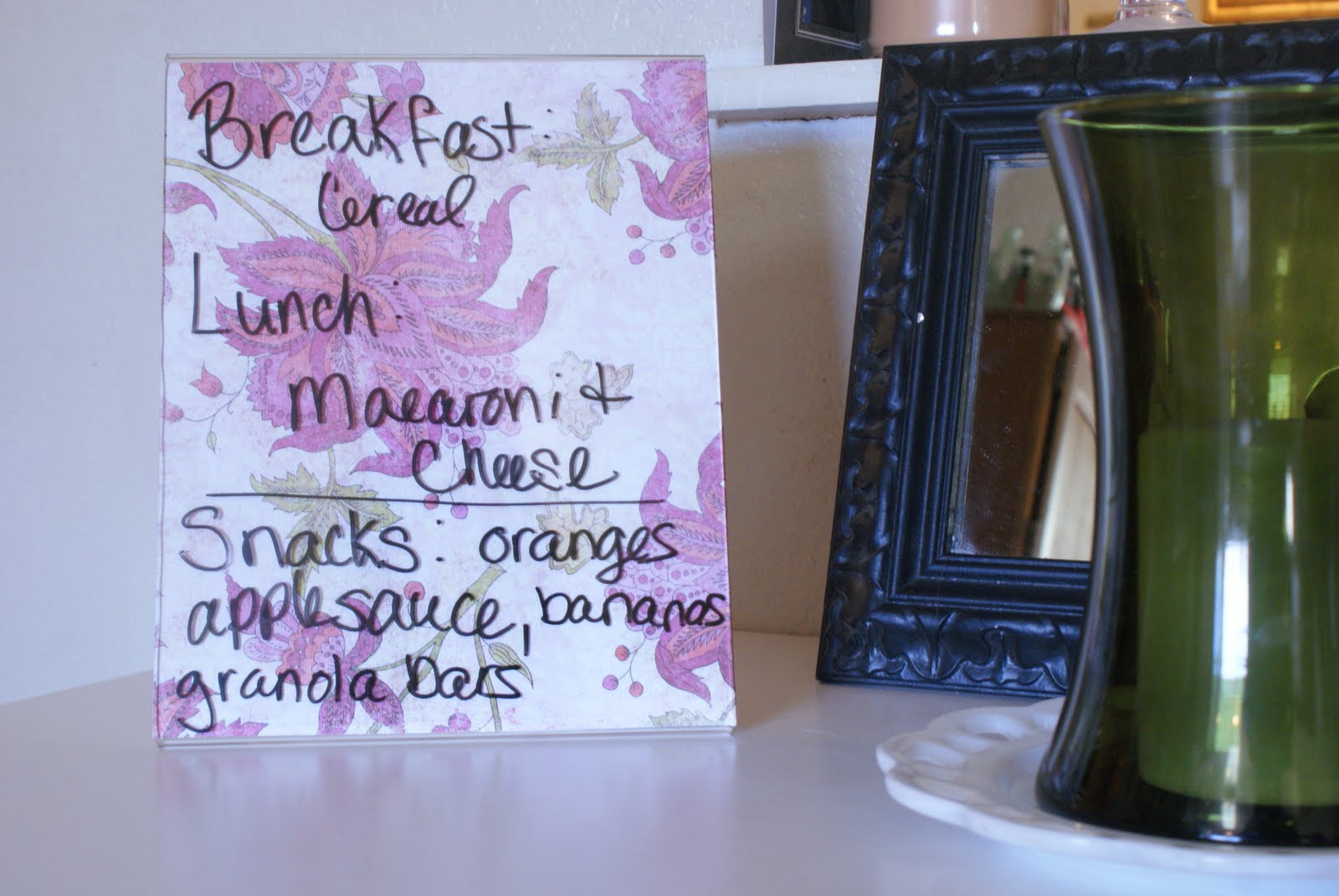 This is a plastic display stand (used for signage/displays in stores) that was only $.69 at Goodwill. The paper inside is scrapbooking paper that I can change out. The marker is dry erase, making it easy to wipe down everyday.