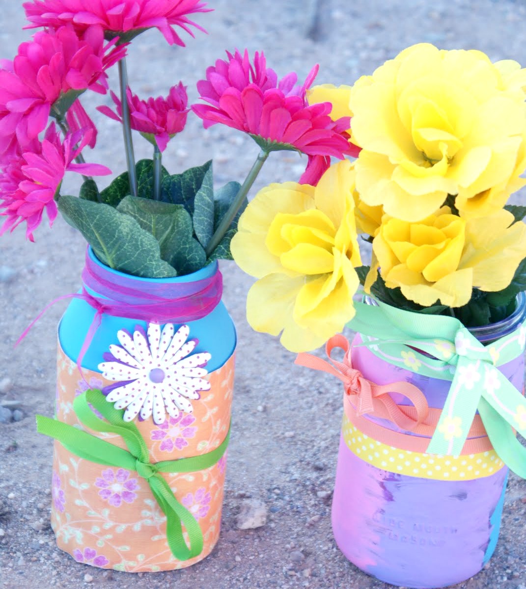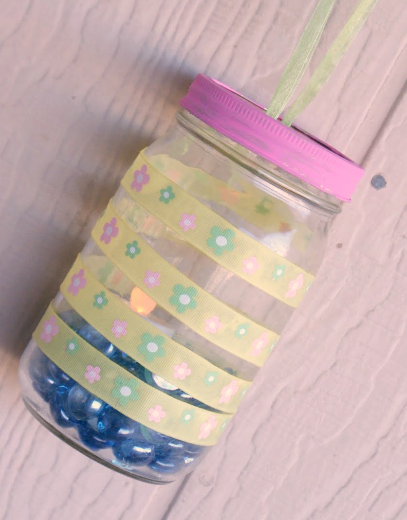 I sprayed the paper with the adhesive after the paint had dried and placed it on the jar. I then tied ribbons on the jar.