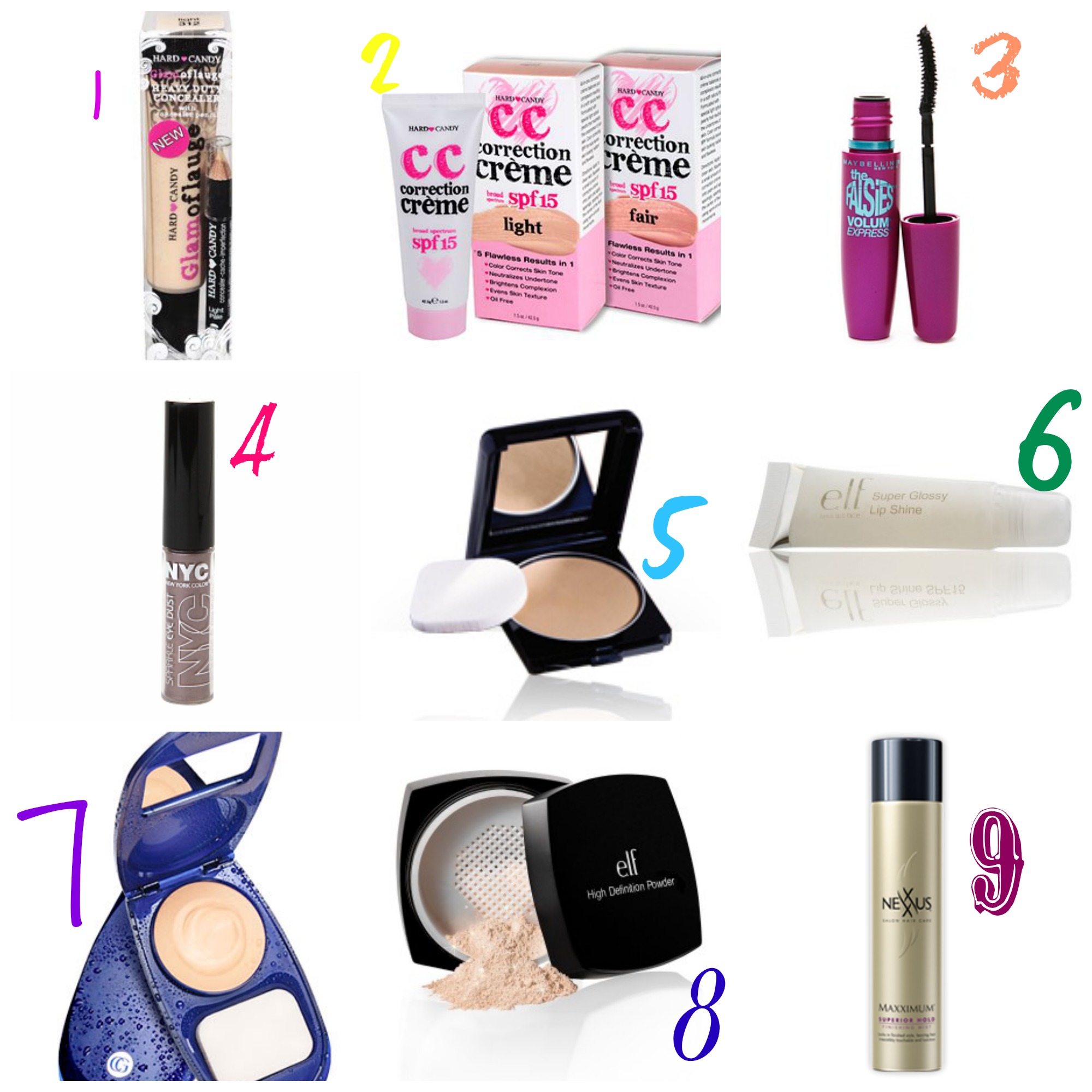 - CC Cream by Hard Candy ~ I must have been livin under a rock as I hadn’t found out about the BB cream fad until recently. It’s basically a tinted moisturizer that provides a little bit more coverage. I tried the CC Cream from Hard Candy and liked it. Typically what I do is put the Glamoflauge over my problem spots and under my eyes, then cover the rest of my face with this. It gives it a nice finish, especially when I do it with the e.l.f. highlighting powder (number 8)